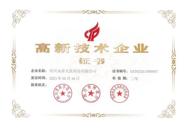 永祥光伏科技獲得高新技術(shù)企業(yè)榮譽(yù)稱號