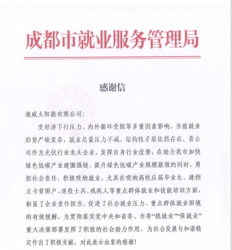 成都市就業局發來感謝信,感謝通威太陽能為成都市“穩就業”“保就業”作出的突出貢獻