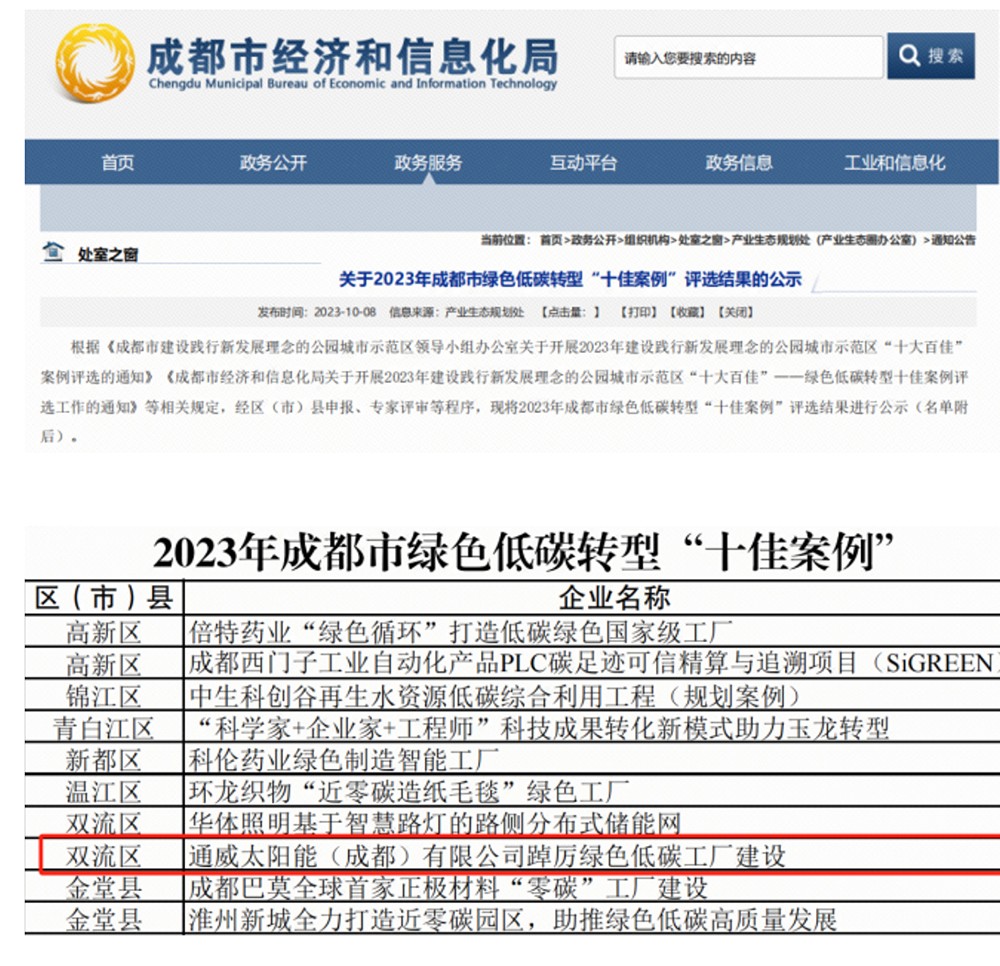 通威太陽(yáng)能雙流基地榮列2023年成都市綠色低碳轉(zhuǎn)型“十佳案例”名單