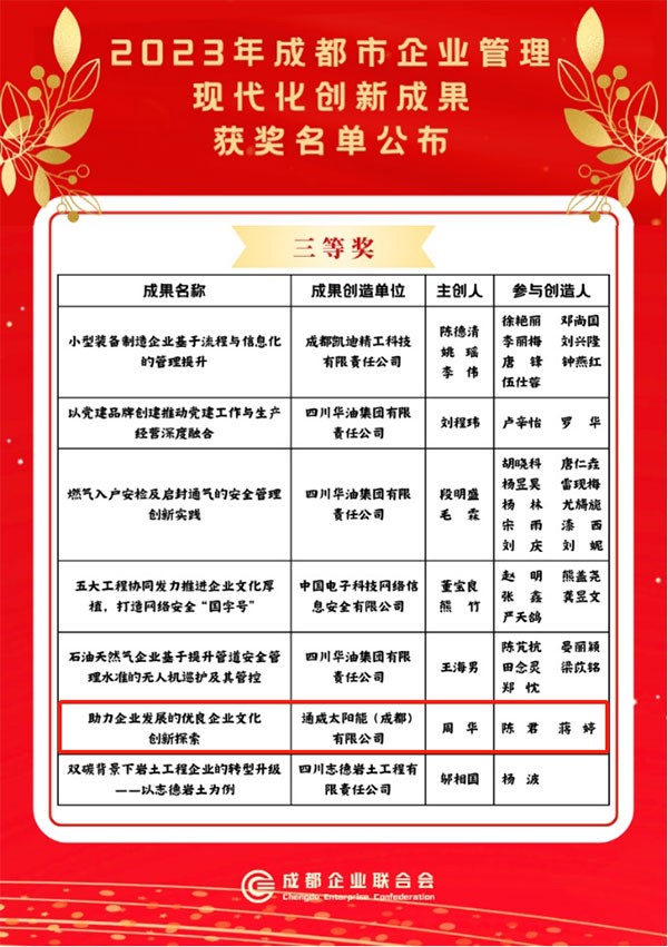 通威太陽能雙流基地榮獲“2023年成都市企業管理現代化創新成果三等獎”