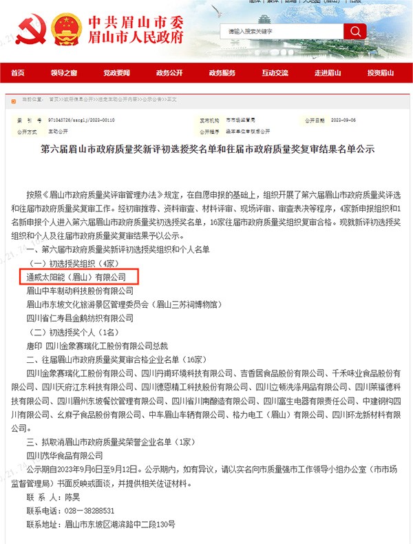 通威太陽能眉山基地榮獲“第六屆眉山市政府質(zhì)量獎”