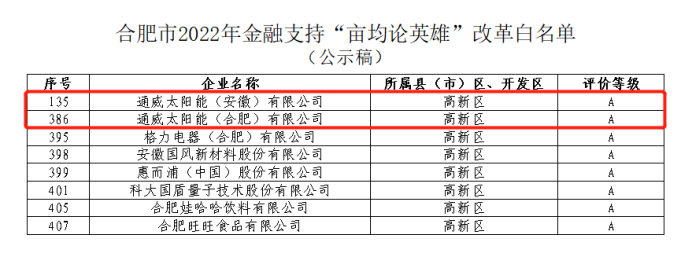 通威太陽能(合肥)有限公司榮評合肥市金融支持“畝均論英雄”改革白名單A類企業