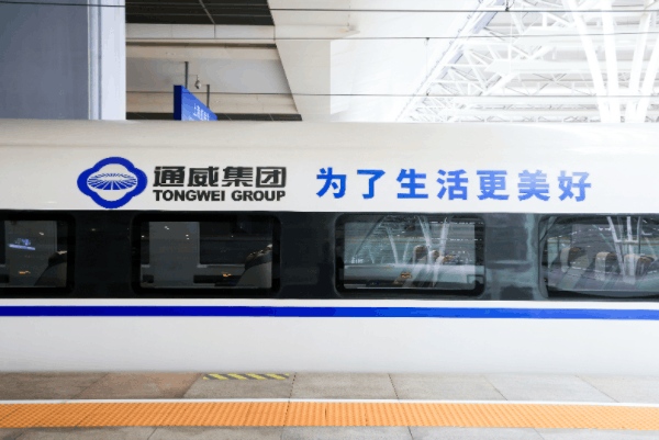 4月12日,通威集團高鐵冠名列車首發儀式在上海虹橋高鐵站成功舉行。自2018年開始,通威成為我國第一個冠名中國高鐵的光伏企業,通威品牌正式接軌高鐵時代,“中國光伏”“中國高鐵”兩張大美名片精彩匯聚、并駕齊驅,助推全球能源轉型。今天,2024“通威”高鐵列車再次啟程,承載著通威綠色發展理念和能源轉型重大使命,穿越京津冀和長三角兩大經濟區,以每年超過2.1億人次的曝光,向全球遞出中國名片。