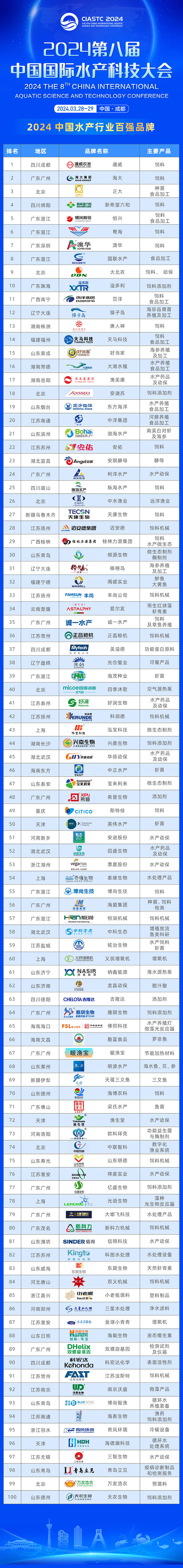 3月28-29日,2024第八屆中國國際水產科技大會在成都通威國際中心隆重舉行。作為大會重要環節之一,“2024中國水產行業百強品牌”全球首發。