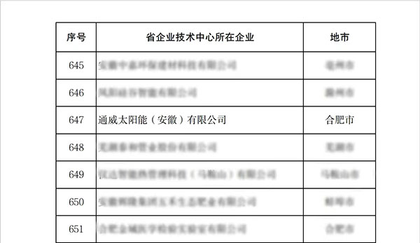 近日,安徽省工業和信息化廳公示了2023年安徽省企業技術中心評價結果,通威太陽能(安徽)有限公司以卓越表現成功通過評審,榮獲該省企業技術中心認證。