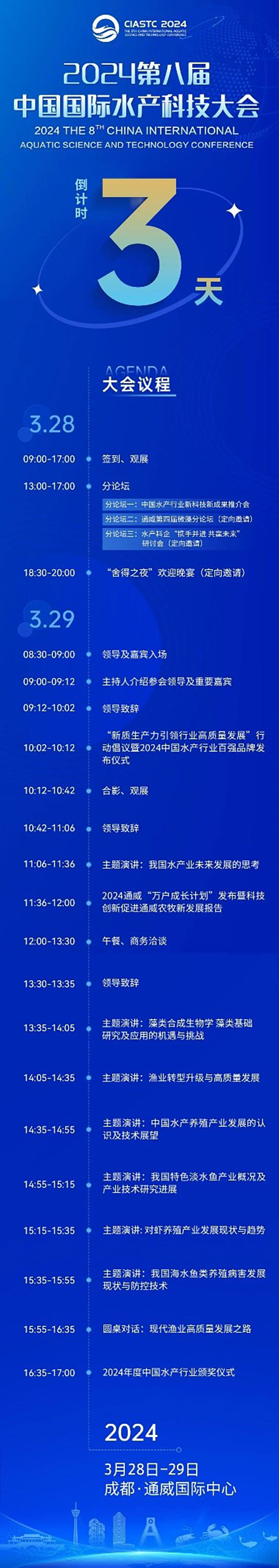 3月28-29日2024第八屆中國國際水產科技大會將在成都通威國際中心隆重舉行大會期間來自中央、省、市政府部門及行業協會重要領導、行業專家、領袖企業家及企業精英將齊聚一堂探討水產行業可持續發展道路讓世界聽到中國水產聲音賦能全球水產行業高質量發展