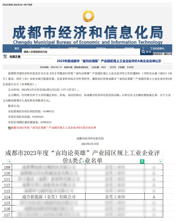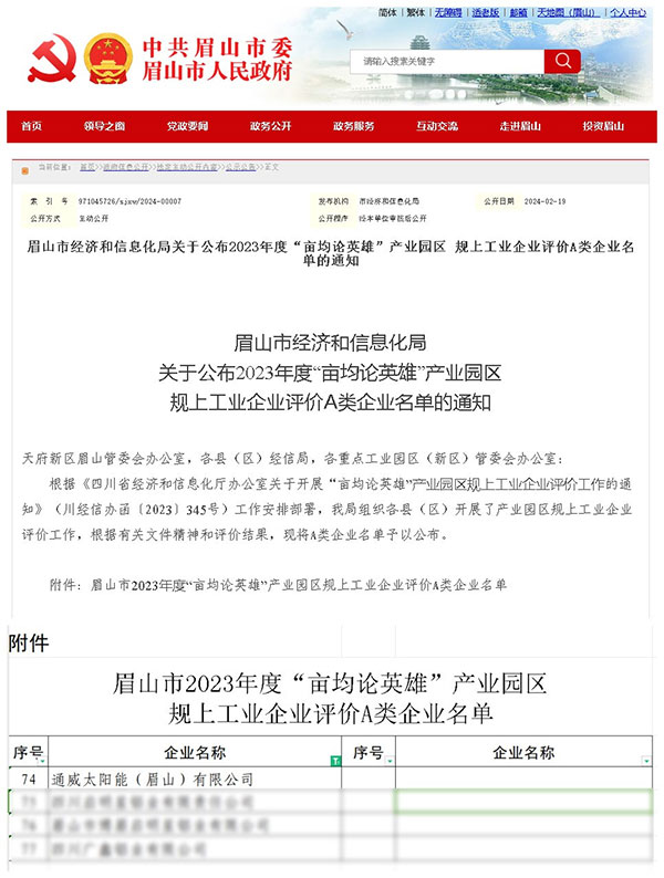 2月23日,按照四川省經濟和信息化廳辦公室《關于開展2023年度“畝均論英雄”產業園區規上工業企業評價工作的通知》(川經信辦函〔2023〕345號)要求,經區(市)縣相關部門對數據采集、信息審核和綜合評價等程序,成都市經濟和信息化局公示了2023年度成都市“畝均論英雄”產業園區規上工業企業評價A類企業名單、中共眉山市委市政府官方網站正式公布了《眉山市2023年度“畝均論英雄”產業園區規上工業企業評價A類企業名單》,通威太陽能雙流基地、通合項目、眉山基地分別榮列其中。