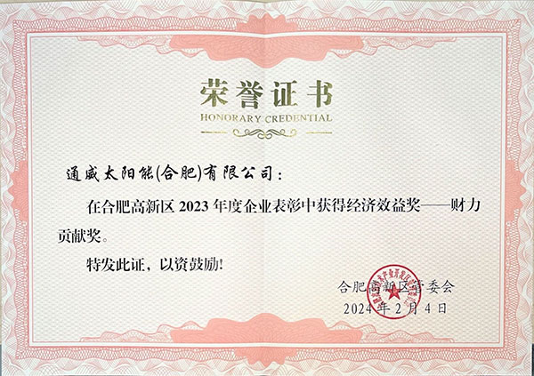 2月4日下午,合肥市高新區(qū)管委會(huì)召開2024年合肥高新區(qū)企業(yè)表彰大會(huì),就2023年為高新區(qū)經(jīng)濟(jì)社會(huì)發(fā)展作出突出貢獻(xiàn)的優(yōu)秀企業(yè)進(jìn)行表彰,通威太陽(yáng)能(合肥)有限公司獲得高新區(qū)經(jīng)濟(jì)效益獎(jiǎng)——工業(yè)財(cái)力貢獻(xiàn)前十名、招商引資獎(jiǎng)——投資進(jìn)度獎(jiǎng)表彰。
