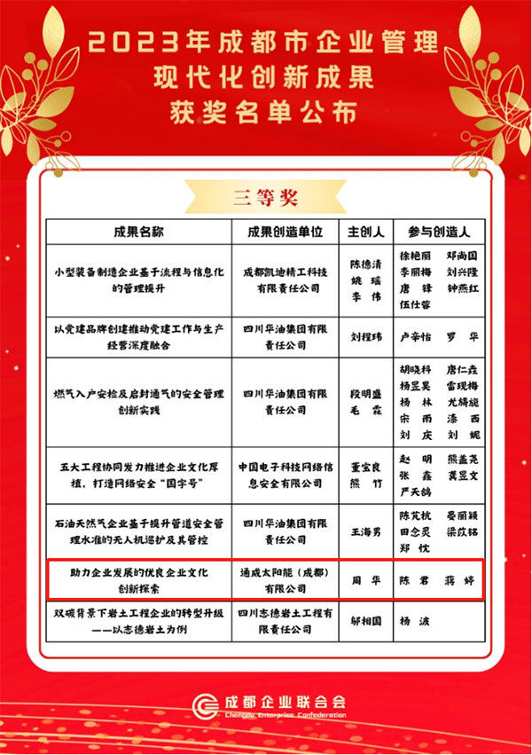 2月5日,成都企業聯合會公布了2023年成都市企業管理現代化創新成果獲獎名單,通威太陽能雙流基地憑借在企業創新管理方面的突出成績榮獲“2023年成都市企業管理現代化創新成果三等獎”。