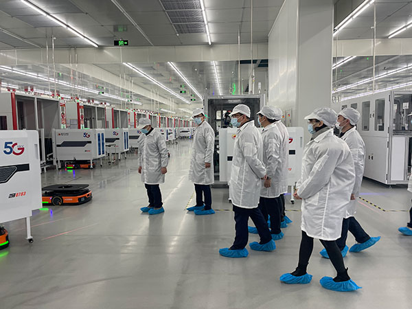 現(xiàn)場評審專家組首先在項目現(xiàn)場聽取了通威太陽能金堂基地發(fā)展歷程、5G項目建設(shè)情況、網(wǎng)絡(luò)基礎(chǔ)設(shè)施建設(shè)情況、項目生產(chǎn)現(xiàn)場升級及成效價值等整體匯報。隨后信息部負(fù)責(zé)人帶領(lǐng)領(lǐng)導(dǎo)專家組一行深入金堂S2車間進(jìn)行了現(xiàn)場考察,并介紹了通威太陽能發(fā)展布局、經(jīng)營狀況、產(chǎn)品特色及5G智能制造場景等,近距離觀摩了5G IGV小車、機(jī)械臂等智能化設(shè)備的運(yùn)行及工廠生產(chǎn)系統(tǒng)的運(yùn)行、調(diào)度、數(shù)據(jù)監(jiān)測等全流程智能調(diào)度情況。領(lǐng)導(dǎo)專家組一行對通威高度智能化的生產(chǎn)現(xiàn)場和精細(xì)化的管理模式給予了高度評價,并贊揚(yáng)公司積極開展5G+工業(yè)互聯(lián)網(wǎng)應(yīng)用,助力光伏加速數(shù)字化轉(zhuǎn)型,一致同意該項目通過現(xiàn)場核查。
