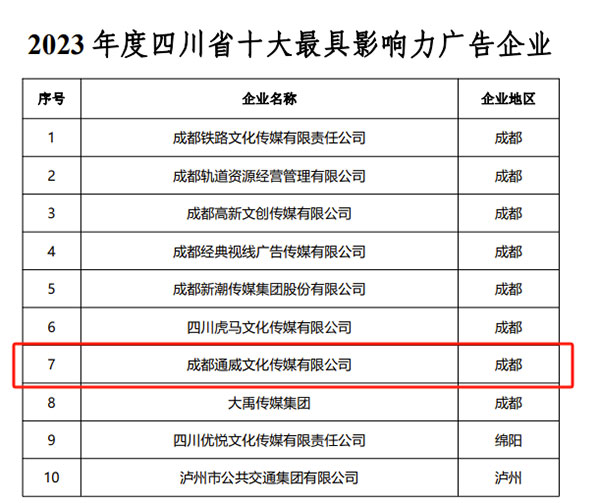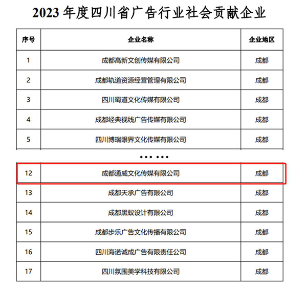 為樹立行業標桿,打造明星廣告企業,表彰在2023年度取得優秀成績的會員企業、行業協會和個人,四川省廣告協會于去年12月開展了2023年度四川省廣告行業表彰活動。根據《評審辦法》和《初評評分標準》要求,經評審委員會考核打分,通威傳媒獲評“四川省十大最具影響力廣告企業”“四川省廣告行業社會貢獻企業”兩項殊榮。