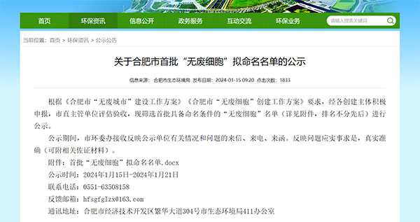 關(guān)于合肥市首批“無廢細(xì)胞”擬命名名單的公示