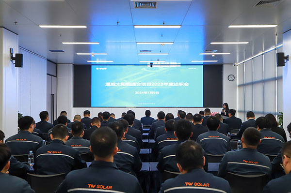 砥礪奮進創佳績,戮力同心續華章,1月9日,通威太陽能通合項目順利召開2023年度中干述職會議,通威太陽能總經理周華、副總經理宋梟、總經理助理陳君,通合新能源總經理助理羅曉云、郭寬新及各部門負責人及核心骨干代表出席本次會議。