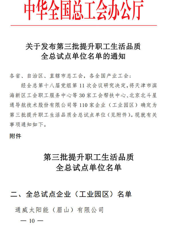 近日,全國總工會發布了“塑造職工幸福生活幸福環境企業”試點單位名單,通威太陽能眉山基地成功入選該項試點名單。