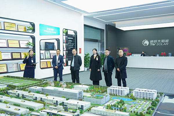在通威太陽能智能制造展廳,邢志剛董事長一行聽取通威太陽能發(fā)展歷程、項(xiàng)目建設(shè)、產(chǎn)能布局及取得的榮譽(yù)獎(jiǎng)項(xiàng)等相關(guān)情況介紹,詳細(xì)了解了通威太陽能雙流基地項(xiàng)目建設(shè)進(jìn)度、項(xiàng)目投產(chǎn)情況、產(chǎn)能規(guī)劃以及各板塊產(chǎn)業(yè)布局情況。