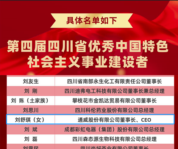 通威股份董事長、CEO劉舒琪榮獲“四川省優秀中國特色社會主義事業建設者”稱號。劉舒琪董事長同時還擔任中國光伏行業協會副理事長、成都市工商業聯合會執委、四川省川聯光伏產業商會會長、蓉商總會副會長等職務,曾榮任成都第31屆世界大學生夏季運動會火炬傳遞57號火炬手;榮獲《財富》2023年中國最具影響力的商界女性、2023胡潤U35中國創業先鋒、“四川省工業興省制造強省先進個人”、“第一屆全國和諧勞動關系創建工作先進個人”、“2023年度綠色能源企業家”等榮譽稱號。