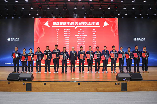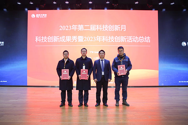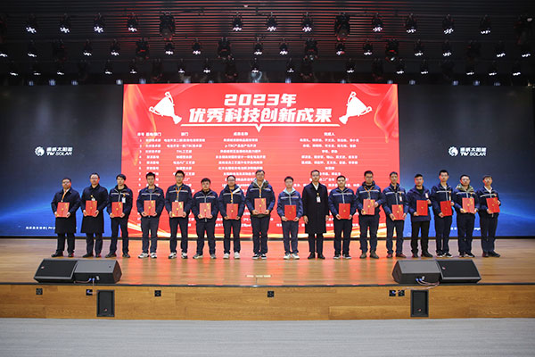 在“科技創新成果秀”環節,16項科技成果的完成人依次上臺,從核心技術、創新點、成效等方面作成果分享,生動展現了通威太陽能扎實的技術積淀和強大的研發實力,贏得了現場觀眾陣陣掌聲。隨后,雙流基地總經理助理徐濤為“2023年優秀科技創新成果”獲獎代表頒發榮譽證書。投票環節,聚焦研發創新、工藝提升和技術改造,觀眾票選出3項“最具人氣科技創新成果”,分別是“異質結雙面微晶提效”“p-TBC產品量產化開發”“TOPCon電池超薄poly工藝開發”項目,通威股份光伏技術部光伏研究院院長蔣方丹博士上臺授獎,現場氣氛熱烈。