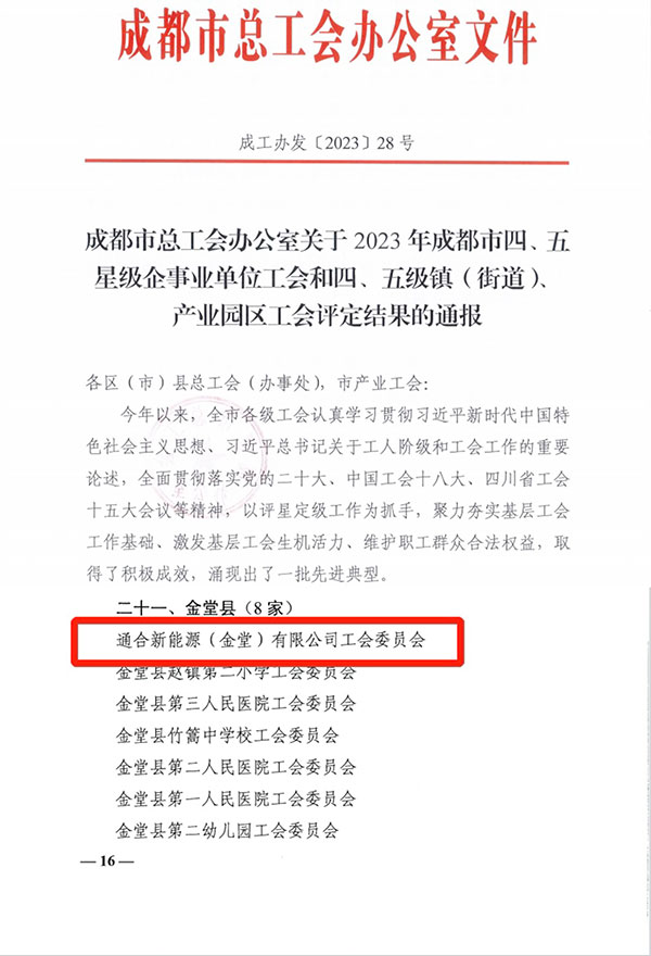 近日,成都市總工會發布《成工辦發〔2023〕28號成都市總工會辦公室關于2023年成都市四、五星級企事業單位工會和四、五級鎮(街道)、產業園區工會評定結果的通報》,其中,通合新能源工會被成都市總工會評為“2023年成都市四星級工會”。