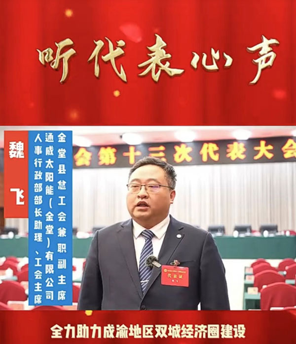 會(huì)中,魏飛接受采訪表示,作為光伏產(chǎn)業(yè)一線工人代表參會(huì)并當(dāng)選,深感責(zé)任重大,接下來將堅(jiān)定信心、立足崗位,著力服務(wù)中心、服務(wù)大局,把個(gè)人和企業(yè)的成長(zhǎng)融入到金堂縣高質(zhì)量發(fā)展的大局中,貢獻(xiàn)通威工人力量。