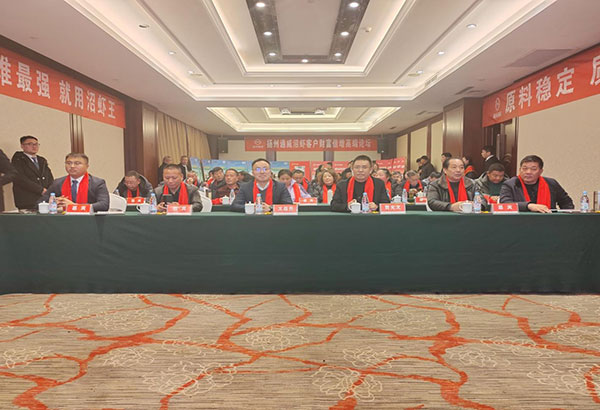 12月15日,揚州通威在高郵匯富金陵酒店順利召開沼蝦產業財富倍增高端論壇會,華東一區總經理賈光文、揚州公司副總經理文昌齊,農發特種水產研究所配方師田景文、公司所有中層管理人員以及來自高郵區域沼蝦養殖行業的40余名優質經銷商朋友齊聚一堂,共同參加此次會議。