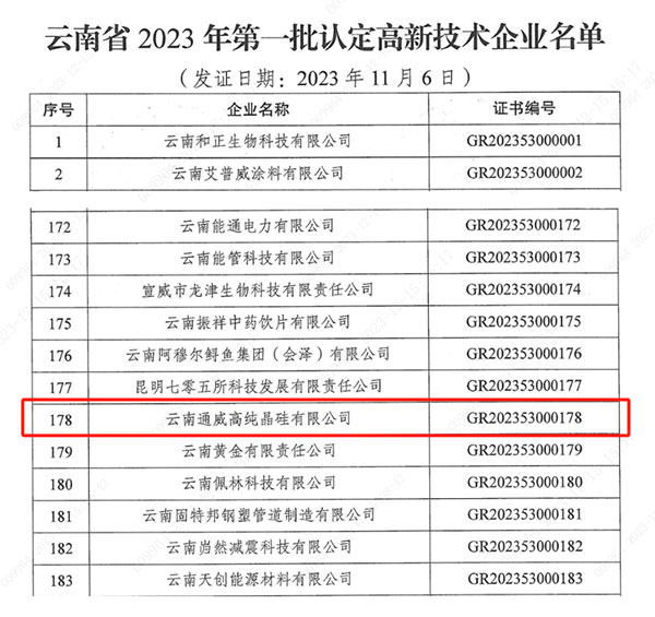 近日,全國(guó)高新技術(shù)企業(yè)認(rèn)定管理工作領(lǐng)導(dǎo)小組辦公室公示云南省2023年第一批高新技術(shù)企業(yè),云南通威通過(guò)認(rèn)定,榮獲“高新技術(shù)企業(yè)”榮譽(yù)稱號(hào)。