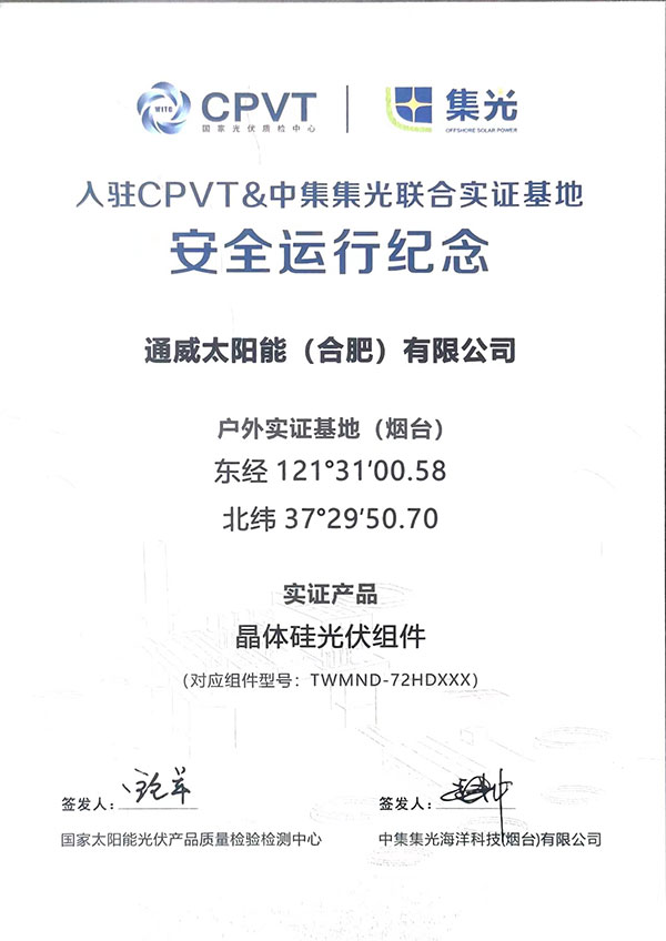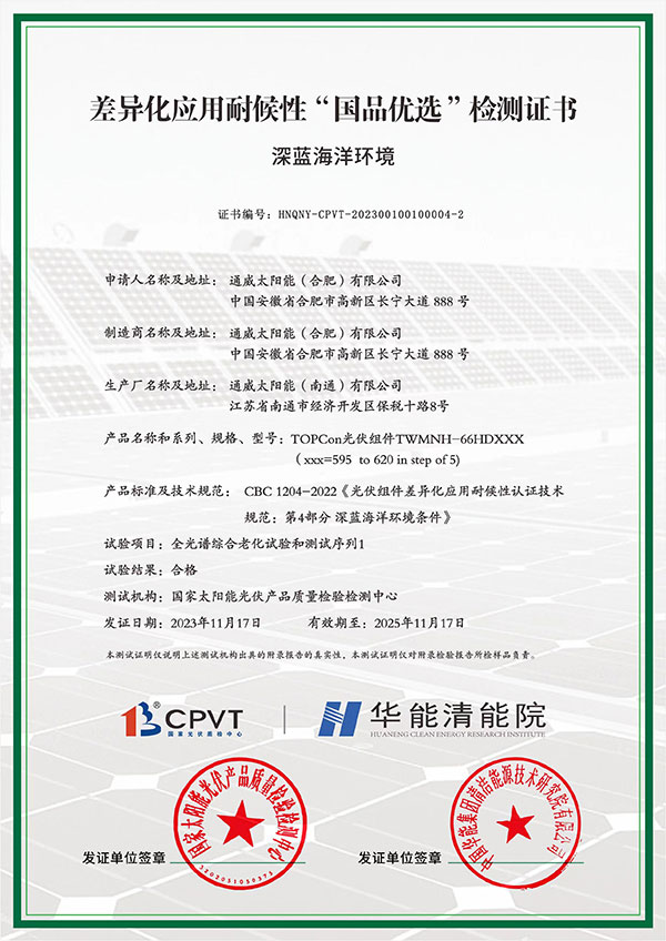 近日,由國家太陽能光伏產品質量檢驗檢測中心(CPVT)與中集集光聯合主辦,以“碧海漾銀沙,實證論英雄”為主題的2023海上光伏系統高質量發展論壇在山東煙臺召開。該會議依托CPVT、中集集光海上實證平臺,包括通威在內首批共入駐24家光伏組件與輔材廠家,其中通威太陽能TOPCon 210R矩形組件TWMNH-66榮獲“差異化應用耐候性‘國品優選’檢測證書”,受到了社會和業界的廣泛關注和贊譽。