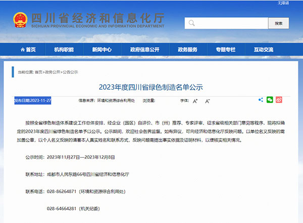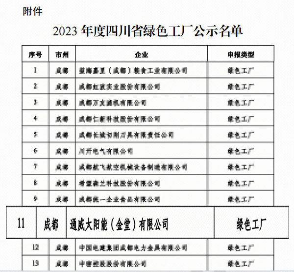 11月27日,四川省經(jīng)濟和信息化廳發(fā)布了《2023年度四川省綠色制造名單公示》(公示期截至12月8日),通威太陽能金堂公司成功入選2023年度“四川省綠色工廠”,這是繼雙流、眉山基地之后,公司榮獲的又一綠色制造體系榮譽。