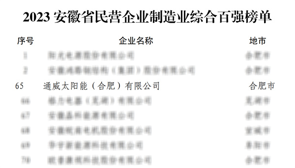 通威太陽(yáng)能(合肥)有限公司榮登2023年度安徽省民營(yíng)企業(yè)雙百?gòu)?qiáng)榜單