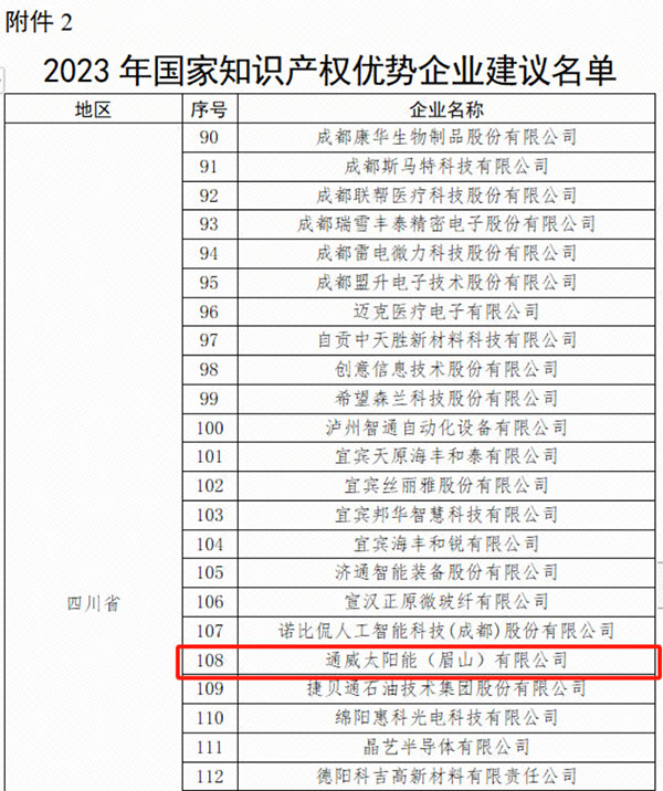 11月13日,國家知識產(chǎn)權(quán)局發(fā)布了《關(guān)于2023年度國家知識產(chǎn)權(quán)優(yōu)勢企業(yè)和示范企業(yè)評定結(jié)果的公示》,通威太陽能眉山基地憑借卓越的知識產(chǎn)權(quán)實力,成功獲評“國家知識產(chǎn)權(quán)優(yōu)勢企業(yè)”。
