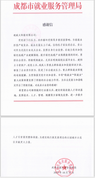 成都市就業局發來感謝信,感謝通威太陽能為成都市“穩就業”“保就業”作出的突出貢獻