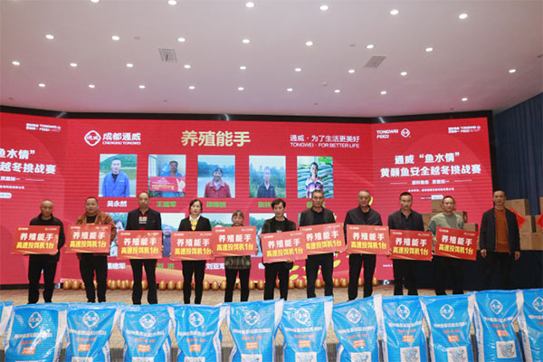10月26日,成都通威“魚水情黃顙魚安全越冬挑戰賽”在樂山井研順利召開,通威農發副總經理、原料部總監兼成都通威總經理何東鍵、成都通威營銷總經理劉偉、通威農發特種水產研究所營養師馮鵬、成都通威市場部服務經理張佐等嘉賓應邀出席,現在越冬管理工作越來越困難,為了解決這一問題,誠邀當地經銷商、養殖戶朋友們,共同商討黃顙魚安全越冬的解決措施,并對成都通威“黃顙夏季壯魚高手挑戰賽”進行頒獎表彰。