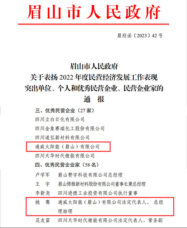 為鼓勵發(fā)展民營企業(yè)、推動全市經(jīng)濟(jì)高質(zhì)量發(fā)展,近日,眉山市人民政府發(fā)布《關(guān)于表揚(yáng)2022年度民營經(jīng)濟(jì)發(fā)展工作表現(xiàn)突出單位、個(gè)人和優(yōu)秀民營企業(yè)、民營企業(yè)家的通報(bào)》,通威太陽能眉山基地榮獲眉山市“2022年度優(yōu)秀民營企業(yè)”稱號,眉山基地總經(jīng)理助理姚騫當(dāng)選眉山市“2022年度優(yōu)秀民營企業(yè)家”。