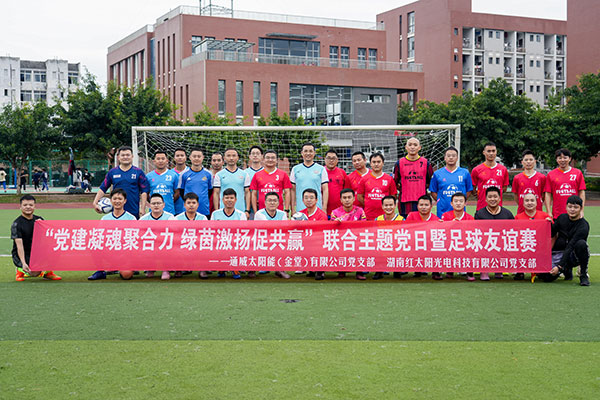 為豐富黨員職工群眾的業(yè)余文化生活,增進(jìn)與黨建共建單位的溝通交流,10月13日,通威太陽(yáng)能金堂基地黨支部與湖南紅太陽(yáng)光電科技有限公司黨支部開(kāi)展了“黨建凝魂聚合力 綠茵激揚(yáng)促共贏”聯(lián)合主題黨日暨足球友誼賽。紅太陽(yáng)光電公司董事長(zhǎng)肖昕、金堂基地黨支部書(shū)記、總經(jīng)理助理龐三鳳分別帶領(lǐng)公司代表隊(duì)出戰(zhàn)。