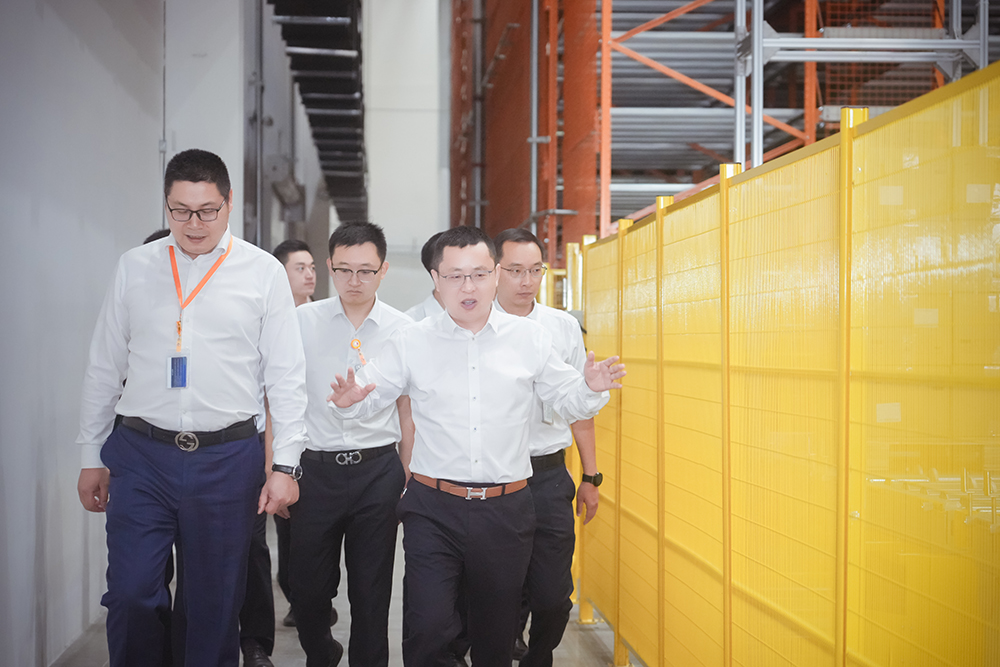 周華總、顧峰總在彭山基地視察投入使用的智能倉庫