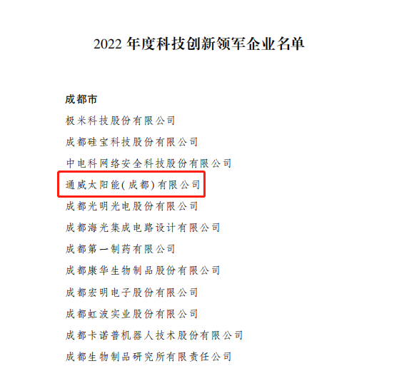 9月19日,四川省人民政府對在 2022年度科技創(chuàng)新工作中表現(xiàn)突出的50家科技創(chuàng)新領軍企業(yè)及48名科技創(chuàng)新領軍企業(yè)家予以通報表揚,通威太陽能(成都)有限公司憑借在科技創(chuàng)新領域的強勁實力成功榮列榜單。