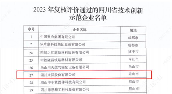 近日,四川省經濟和信息化廳公布了2023年省技術創新示范企業認定及復核通過名單,四川永祥股份有限公司順利通過“2023年省技術創新示范企業”復核。