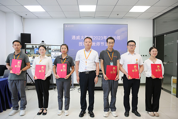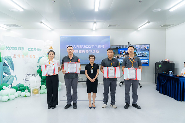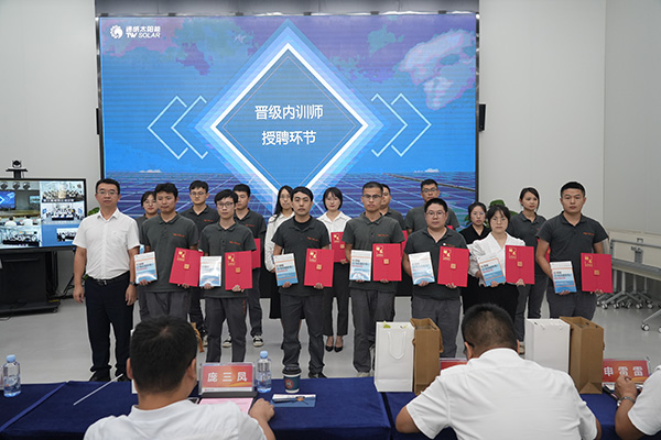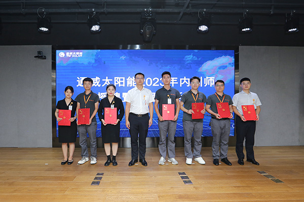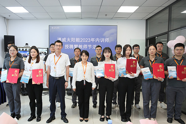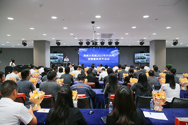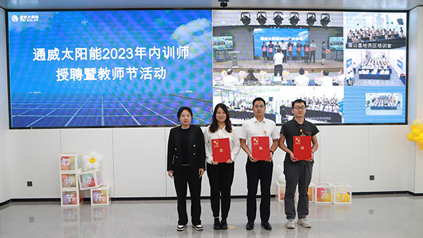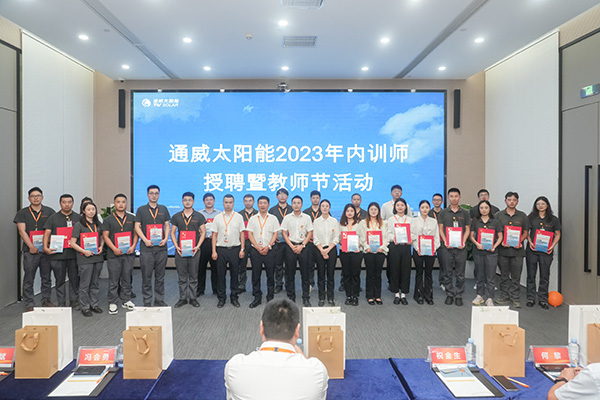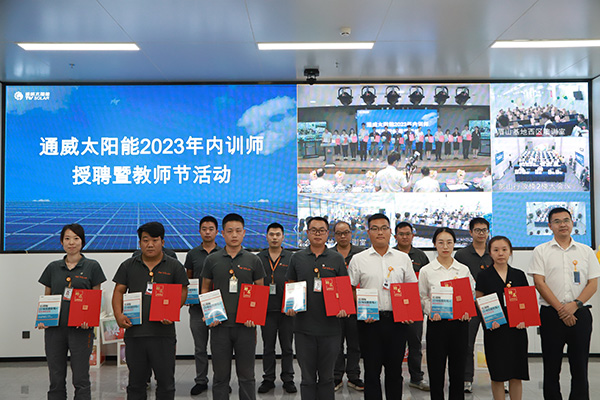 為提升人才培養(yǎng)質(zhì)量,更好地傳承通威文化,不斷強化公司內(nèi)部人才培養(yǎng),致力于營造良好的傳幫帶氛圍,9月8日,通威太陽能各基地同步開展2023年內(nèi)訓師授聘暨教師節(jié)活動,通威太陽能總經(jīng)理助理陳君,通合新能源總經(jīng)理助理羅曉云、郭寬新,通威太陽能金堂基地總經(jīng)理助理龐三鳳、彭山基地兼安徽公司總經(jīng)理助理顧峰、雙流基地總經(jīng)理助理徐濤攜各廠部領(lǐng)導出席活動,各基地內(nèi)訓師共計250余人參加活動。