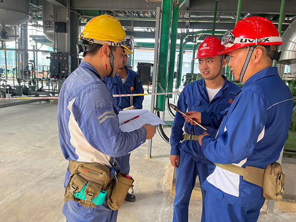 現場,員工胡峻健按照啟泵前檢查清單一一進行確認,確認一項便在清單中勾選一項。發現V08B01壓力低于標準壓力,胡峻健立即匯報主控,往儲罐補充氮氣使其達到清單操作壓力。此舉細心操作得到甘總的認可,贊揚員工嚴格遵循“事事有標準,標準管事實”進行操作。啟泵前檢查完畢,兩名巡檢配合啟P08B01a泵,從匯報、點動排氣再到正式啟泵,在熟記操作標準以及主控與現場巡檢默契的配合下一次性啟泵成功,也贏得了甘總的表揚。