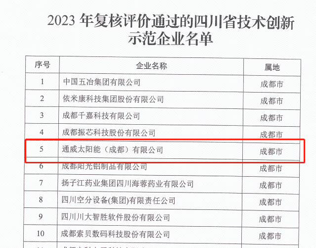 四川省技術(shù)創(chuàng)新示范企業(yè)是指工業(yè)行業(yè)中技術(shù)創(chuàng)新能力較強(qiáng)、創(chuàng)新業(yè)績(jī)顯著、具有重要示范和導(dǎo)向作用的企業(yè)。按照《四川省技術(shù)創(chuàng)新示范企業(yè)認(rèn)定管理辦法》(川經(jīng)信技創(chuàng)〔2021〕206號(hào))有關(guān)規(guī)定,認(rèn)定工作需全面考慮公司在核心競(jìng)爭(zhēng)能力和領(lǐng)先地位、創(chuàng)新能力和研發(fā)投入、行業(yè)帶動(dòng)作用性和自主品牌、盈利能力和管理水平等方面的建設(shè)情況,同時(shí)需通過(guò)市(州)推薦、初審、專(zhuān)家評(píng)審、現(xiàn)場(chǎng)核實(shí)、公示等綜合評(píng)價(jià)程序。最終,通威太陽(yáng)能雙流基地通過(guò)層層審核,成功獲此稱(chēng)號(hào)。