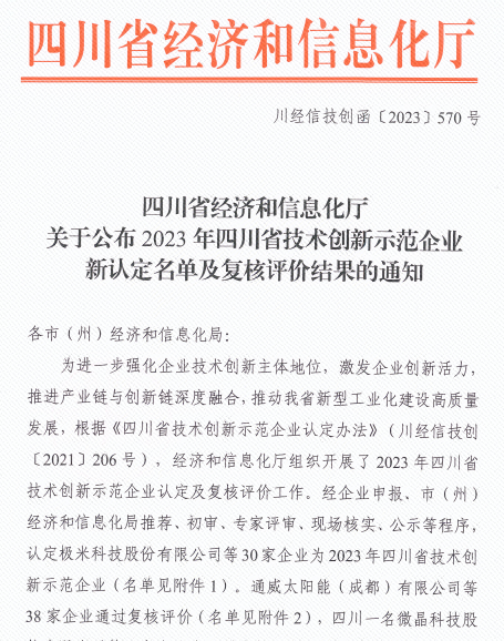 近日,四川省經(jīng)濟(jì)和信息化廳公布了2023年省技術(shù)創(chuàng)新示范企業(yè)認(rèn)定及復(fù)核通過(guò)名單,通威太陽(yáng)能雙流基地憑借在科技創(chuàng)新領(lǐng)域的強(qiáng)勁實(shí)力順利通過(guò)“2023年省技術(shù)創(chuàng)新示范企業(yè)”復(fù)核。