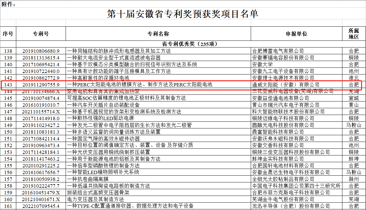 8月29日,安徽省市場監督管理局(知識產權局)發布了《第十屆安徽省專利獎評選公示》(公示期為七個工作日),擬對在2022年度申報的優秀專利獎項目進行推薦及表揚,通威太陽能安徽公司憑借在技術研發創新和知識產權保護的突出表現順利通過這次公示,榮獲安徽省專利獎項目優秀獎。