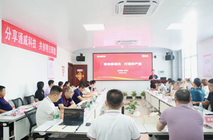 會中,彭繼偉總經理、通威動物營養公司水產技術總監兼營銷總監肖順應、通威動物營養公司原料部經理馬俐分別就通威標準化建設、通威通享模式服務及解決方案、通威原料采購優勢等內容作詳細分享。接著雙方就動物蛋白采購、供應商考察、設備保養、品管與生產部的協同、產品質量監控等進行了詳細交流。