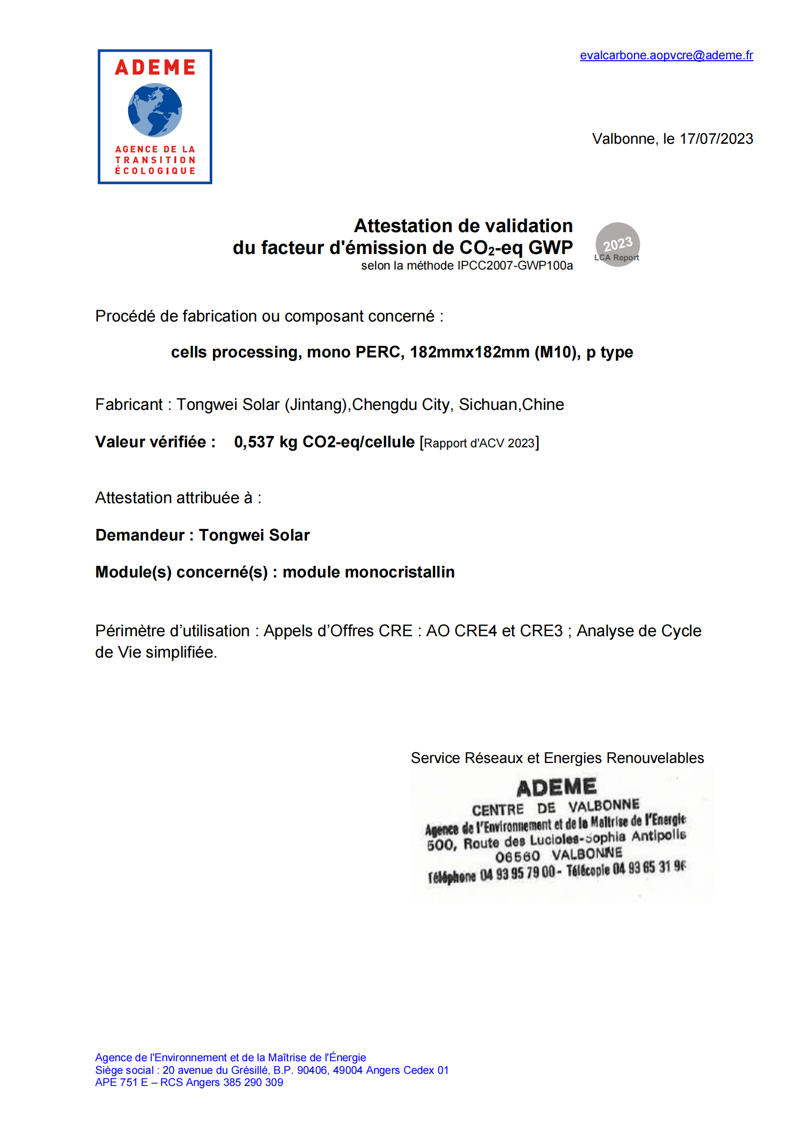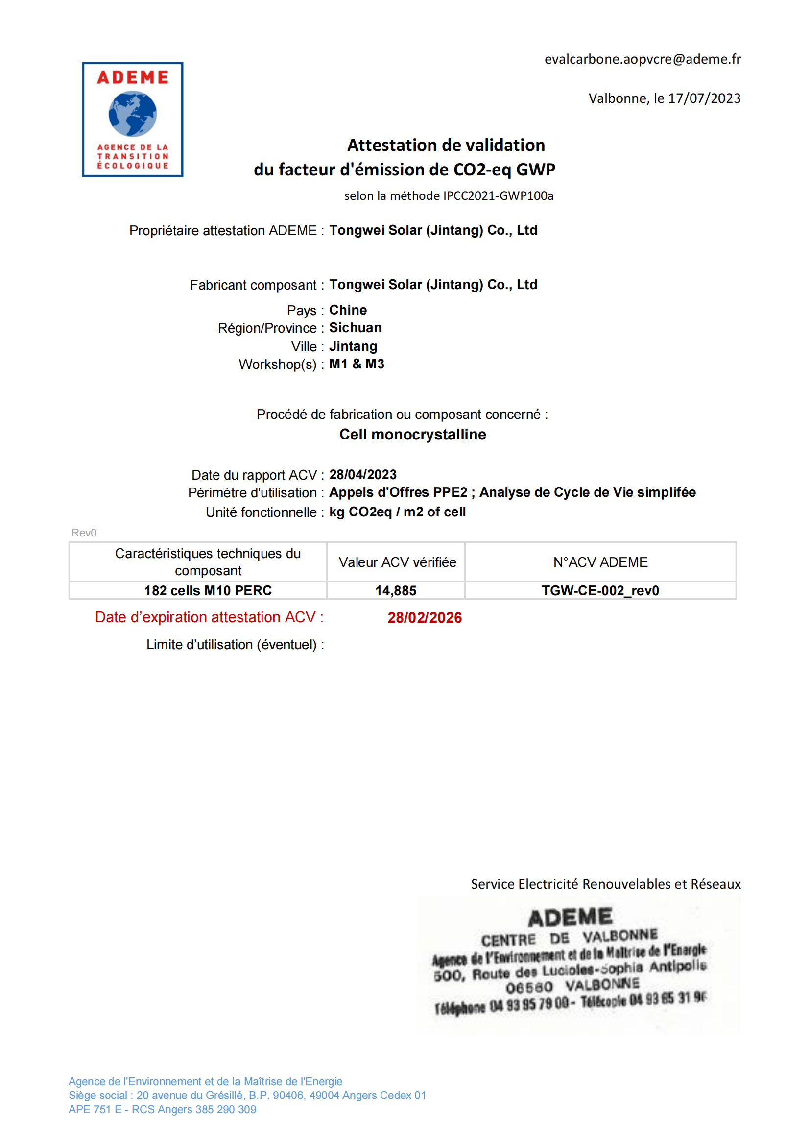 近日,通威太陽能金堂基地順利通過法國碳足跡認證審核,并獲取產品碳足跡證書。