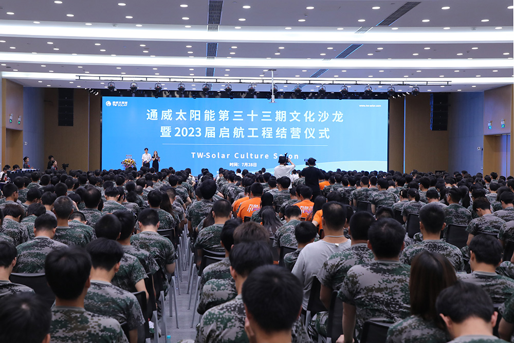 賡續前行再啟航,接續奮斗譜新章。7月28日,通威太陽能第三十三期文化沙龍暨2023屆啟航工程結營儀式圓滿舉行,成都工業學院智能制造學院黨委書記郭成操、西華大學機械工程學院黨委副書記李強、西南石油大學新能源科學與工程黨支部書記俞健、西南交通大學希望學院學生工作處副處長姚佳男、四川農業大學能源與動力工程系主任曾赟、四川輕化工大學化學工程教研室博士周強等高校領導代表出席活動,通威太陽能總經理周華、副總經理宋梟、總經理助理陳君攜全體中高管團隊、骨干員工代表及啟航學員共計1200余人出席本次活動。