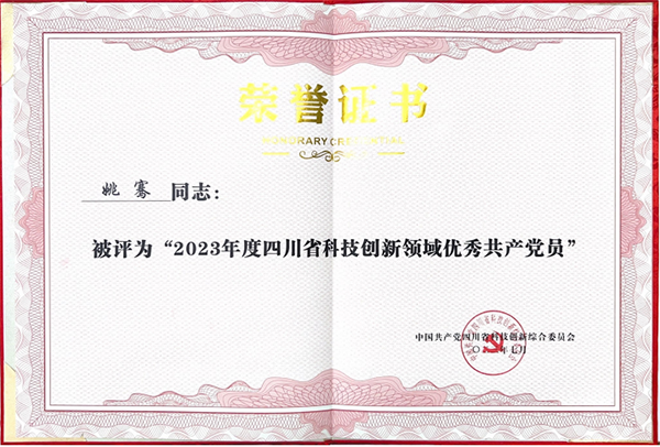 姚總榮獲“2023年度四川省科技創新領域優秀共產黨員”
