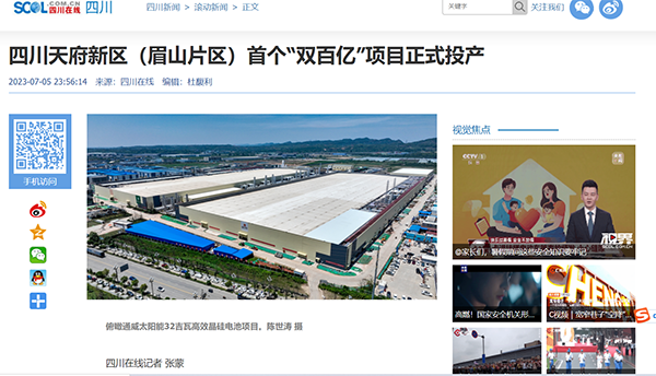 四川衛視《新聞聯播》、四川在線等主流媒體聚焦通威太陽能彭山基地一期高效晶硅電池項目首片下線