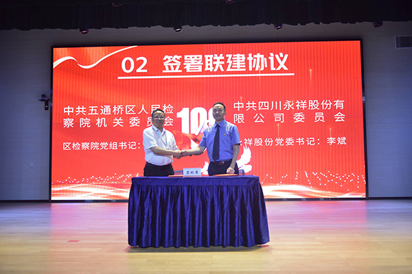 為深入探索檢企黨建聯(lián)建新思路、新模式,搭建黨建交流新平臺(tái),推動(dòng)黨建工作與檢察業(yè)務(wù)工作、企業(yè)生產(chǎn)經(jīng)營(yíng)深度融合,助力營(yíng)造優(yōu)質(zhì)法治營(yíng)商環(huán)境,推動(dòng)五通橋經(jīng)濟(jì)社會(huì)高質(zhì)量發(fā)展,7月7日,中共五通橋區(qū)人民檢察院機(jī)關(guān)黨委、中共四川永祥股份有限公司黨委“檢企聯(lián)建聚合力 黨建引領(lǐng)促發(fā)展”黨建聯(lián)建活動(dòng)順利舉行。五通橋區(qū)檢察院黨組書(shū)記、檢察長(zhǎng)蘇登科,區(qū)檢察院黨組成員、副檢察長(zhǎng)楊科,永祥股份黨委書(shū)記、總經(jīng)理李斌,永祥股份黨委副書(shū)記、永祥新能源黨支部副書(shū)記、永祥股份副總經(jīng)理羅周出席,五通橋區(qū)檢察院、永祥股份黨員同志參加。
