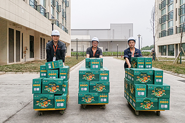 員工代表將禮盒運(yùn)送至各發(fā)放點(diǎn)位