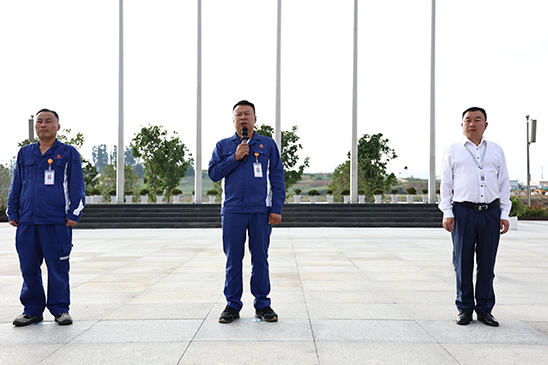在升旗儀式上,獲得近日公司級班組交班比賽第一名的公輔工段2#班組邁著穩健的步伐,昂首挺胸來到升旗臺前,以高昂、飽滿的精氣神做了安全分享、當班工作內容一對一等交接班儀式的匯演工作。團隊成員個個動作標準、聲音洪亮,每個一細節動作展示了標準內容的標準化動作,也是各班組對標準最好的詮釋。全員熱血沸騰,備受鼓舞!
