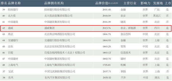2023年,通威品牌價值再創歷史新高,達到2013.76億元,排名從去年的第50位上升至42位,品牌價值比去年增加403.18億元,增加幅度為25%,并與五糧液、長虹共同榮列四川企業最具有價值品牌前三,繼續保持全球水產和光伏兩大行業品牌價值最高這一領先優勢。